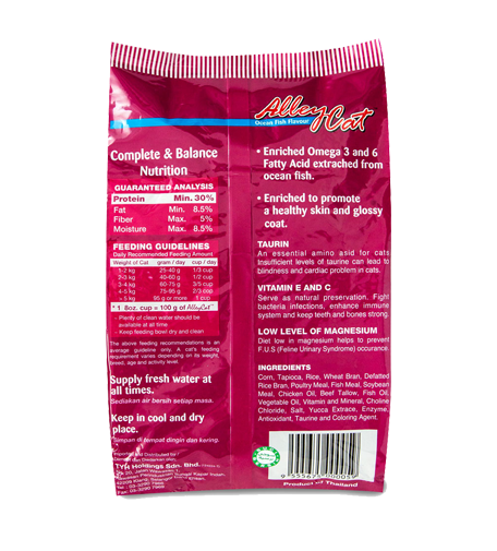 Corn, Tapioca, Rice, Wheat Bran, Defatted Rice Bran, Poultry Meal, Fish Meal, Soybean Meal, Chicken Oil, Beef Tallow, Fish Oil, Vegetable oil, Vitamin and Mineral, Choline Chloride, Salt, Yucca Extrace, Enzyme, Antioxidant, Taurine and Coloring Agent.